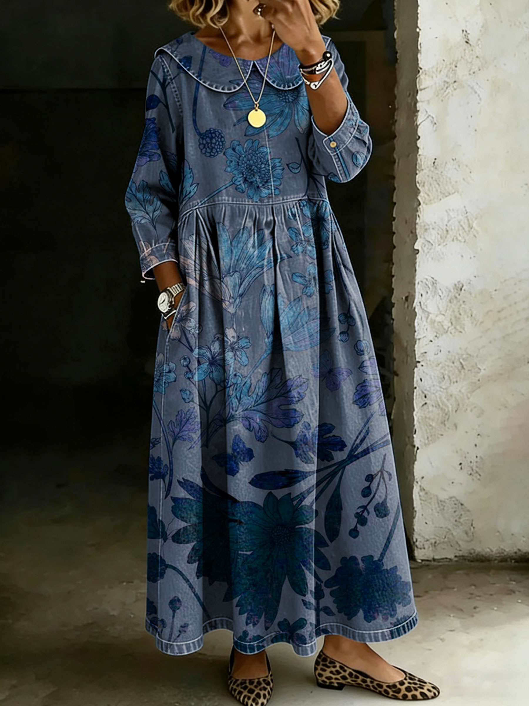 Women's Retro Floral Peter Pan Collar Long-sleeved Loose-fitting Casual Denim Dress