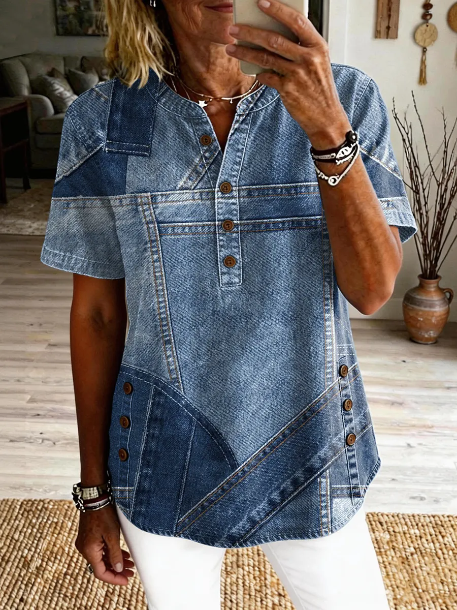 Women's Patchwork Pattern Art Print Casual Short-sleeve Washed Cotton Denim Shirt
