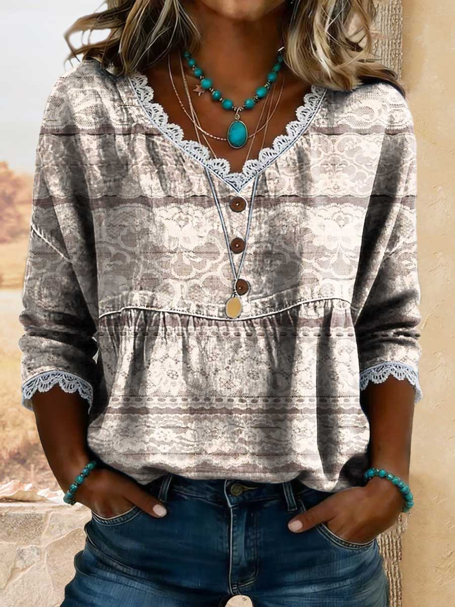 Women's Vintage Lace Print Casual Hollow-out Denim Shirt