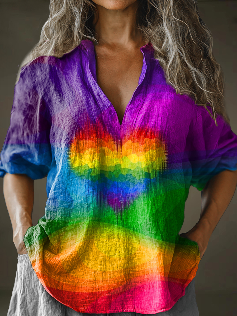Women's Rainbow Heart Art Pattern Print Long Sleeve Comfortable Cotton And Linen Shirt