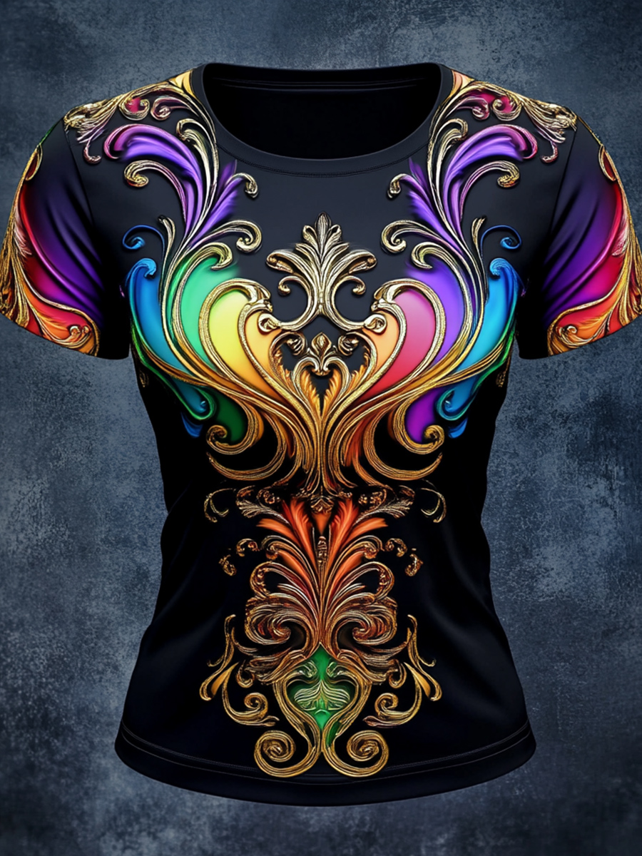Rainbow Gradient Baroque Art Print Vintage Casual T-Shirt
