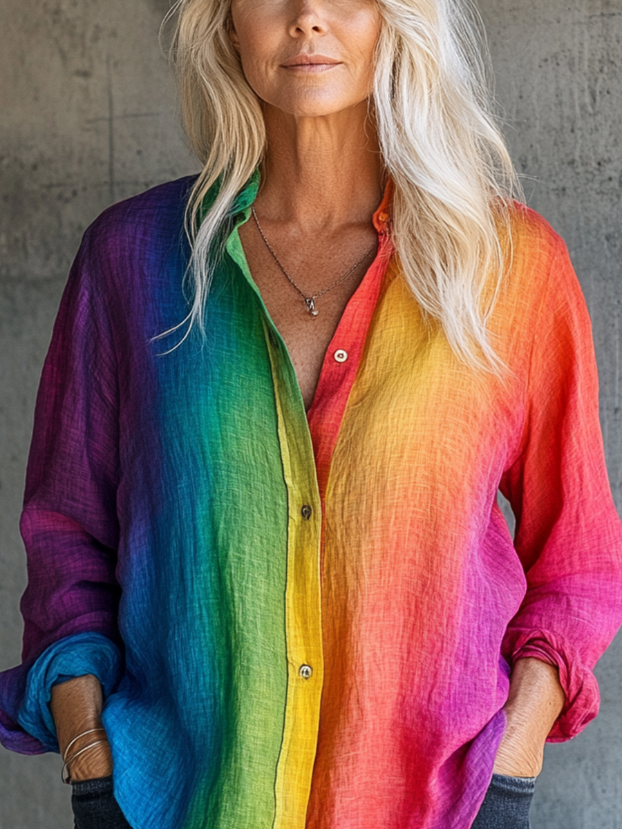 Pride Month LGBT Gradient Rainbow Gay Long Sleeve Cotton and Linen Shirt
