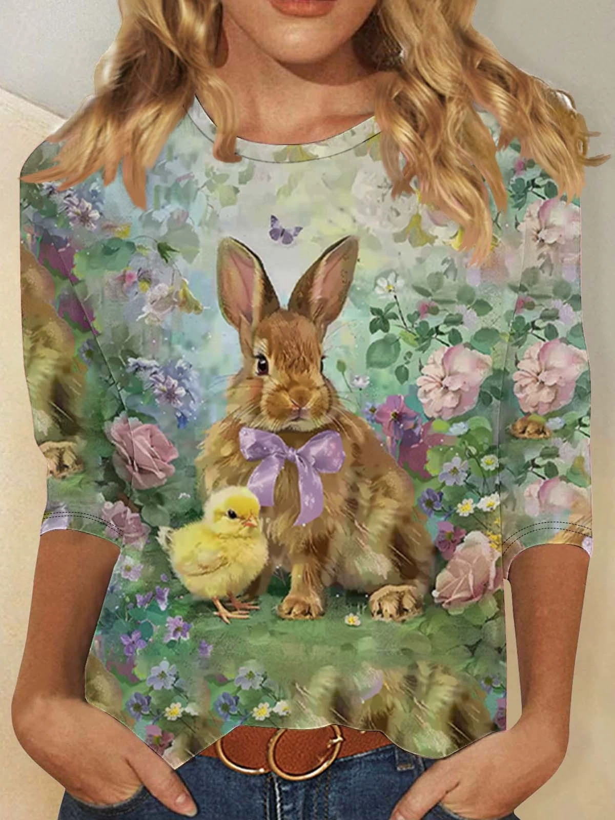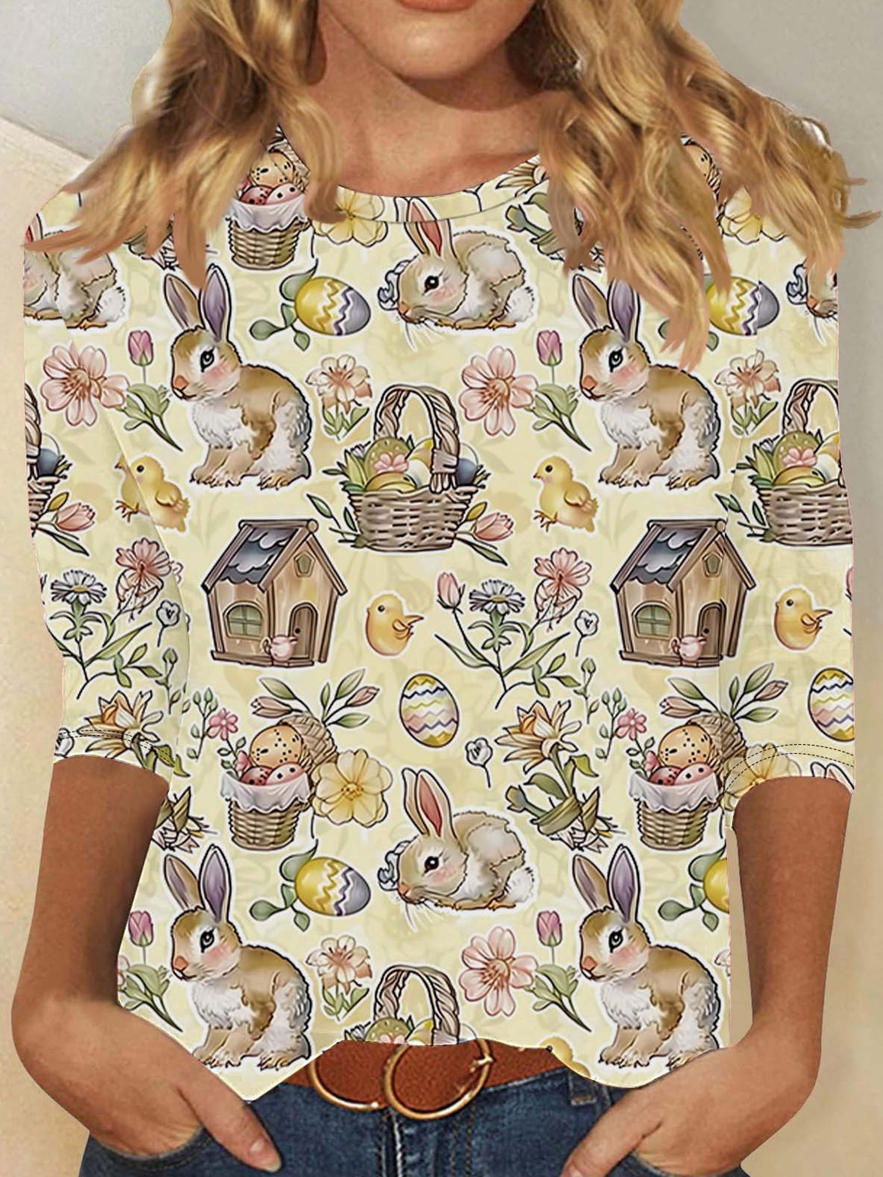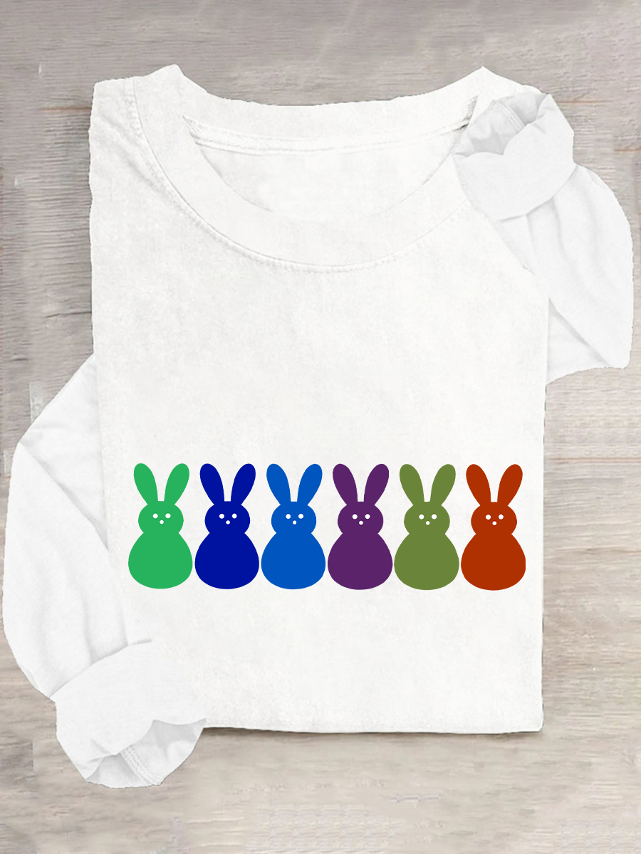 Women's Bunny Easter Round neck long sleeve T-shirt
