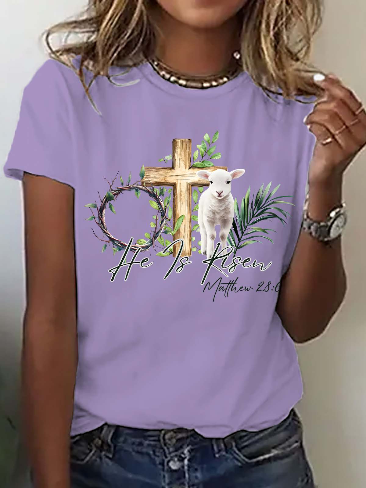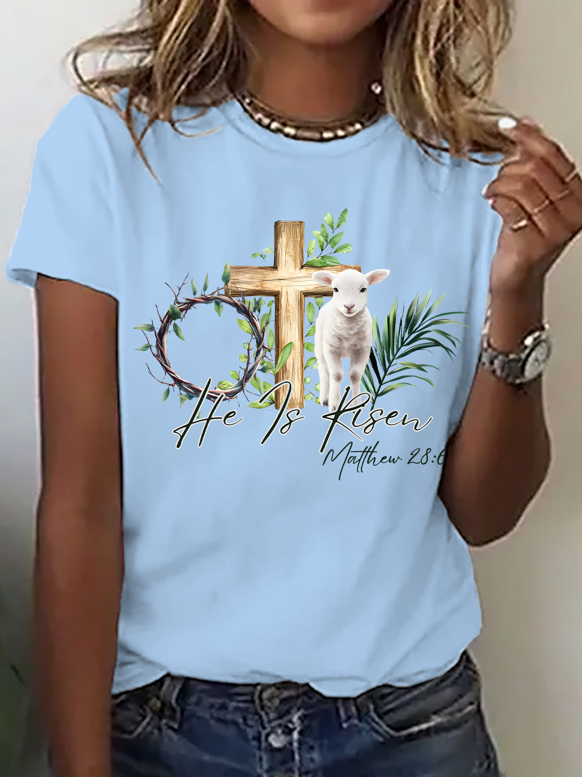 He Is Risen Easter Lamb Cross Christian Bible Verse Cotton T-Shirt