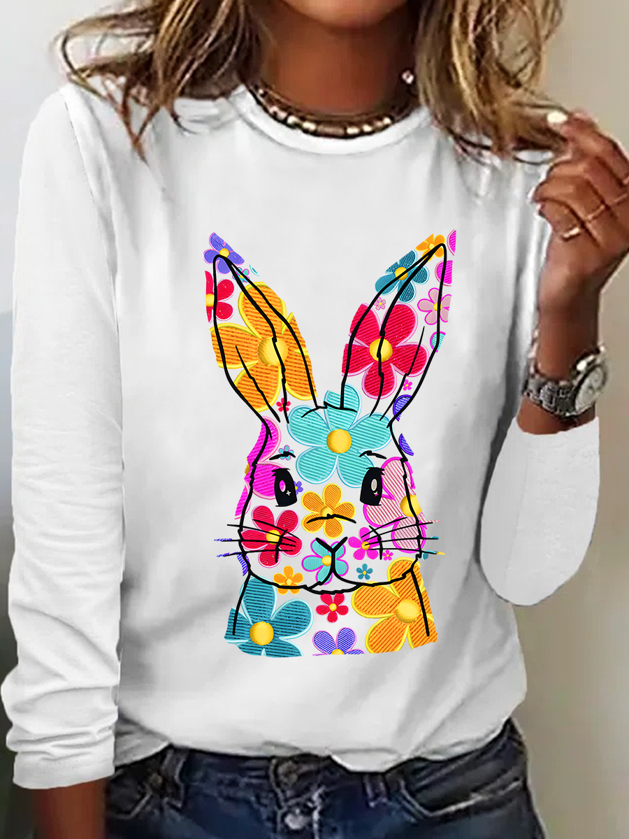 Happy Easter Bunny Flowers Print Casual Long Sleeve Shirt