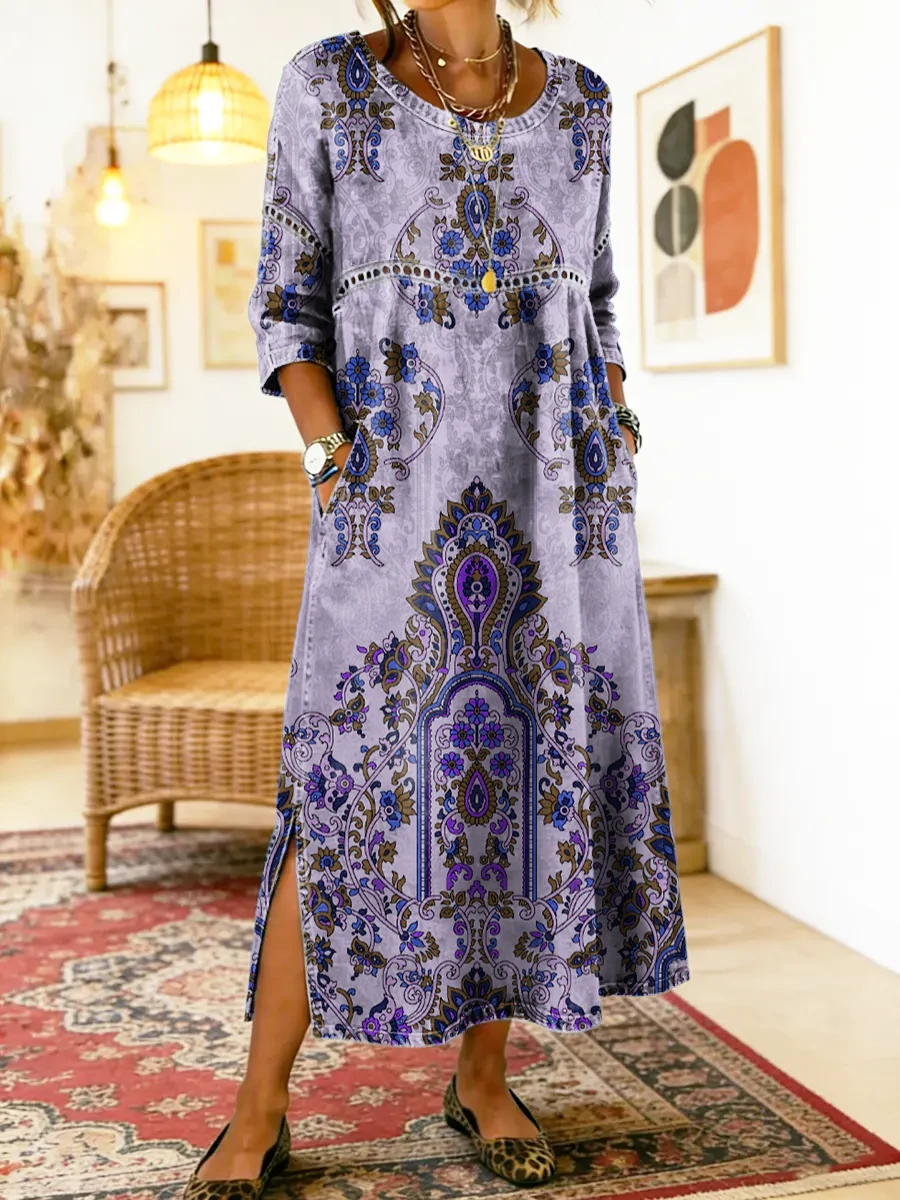 Women's Retro Ethnic Floral Color-Blocked Art Print Casual Long-Sleeve V-Neck Side Pocket Cotton Linen Dress
