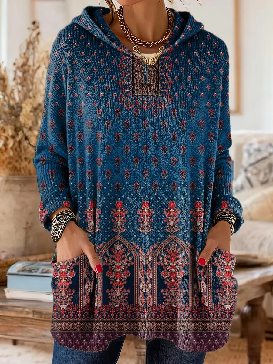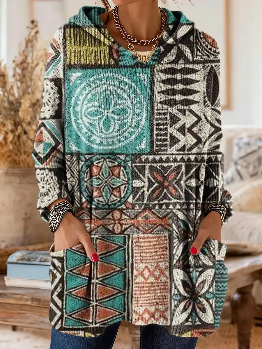 Women's Vintage Ethnic Pattern Art Print Casual Knit Hooded Sweatshirt With Pockets