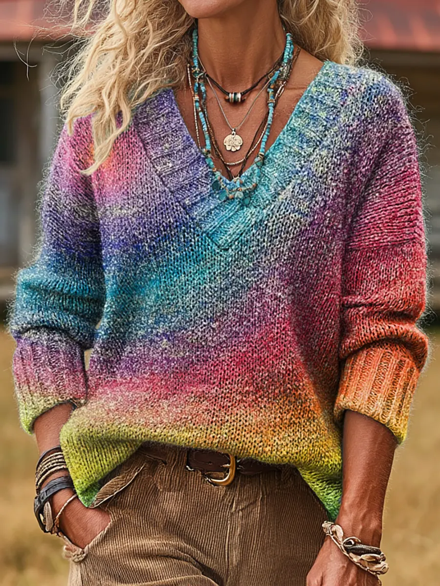 Ethnicity Colorful Gradient Women's Print V-neck Long Sleeve Sweater