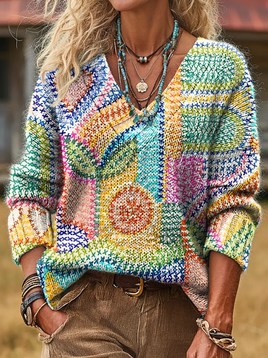 Ethnicity Colorful Color Blocks Women's Print V-neck Long Sleeve Sweater