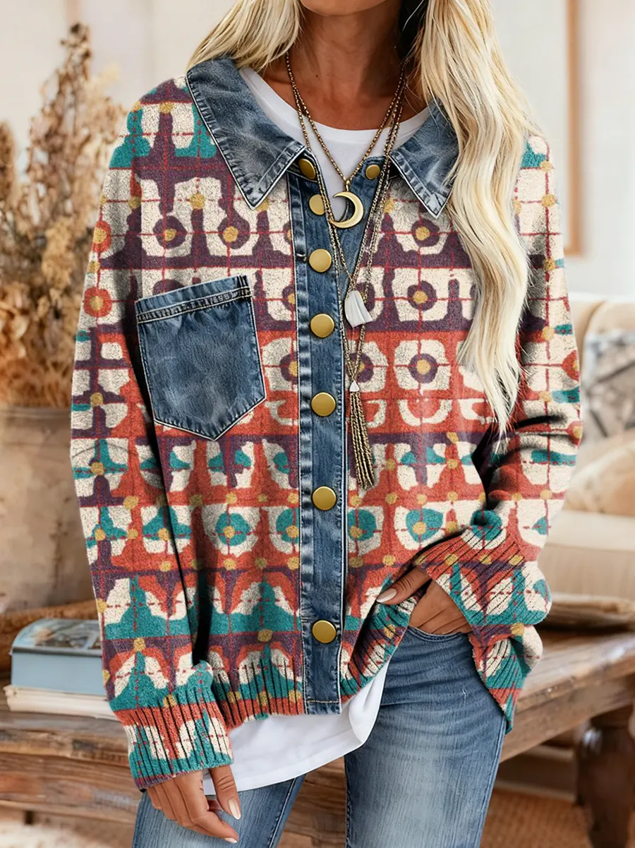 Ethnicity Patchwork Color Blocks Women's Art Print Comfortable Denim Patchwork Knit Sweater