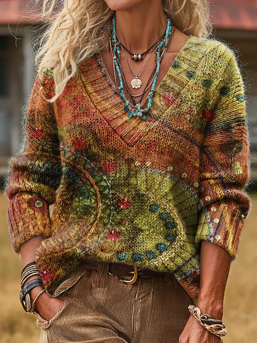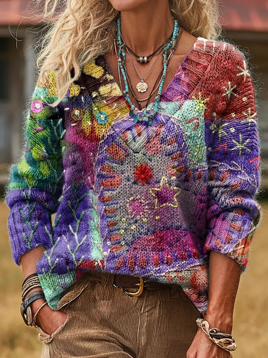 Women's Bohemian Ethnic Pattern Art Print Comfortable V-neck Knit Sweater