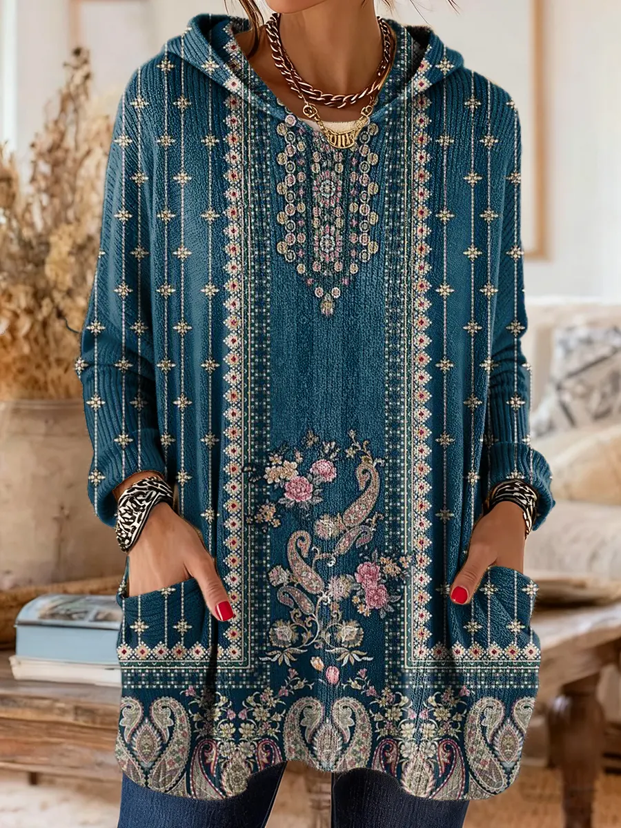 Women's Vintage Ethnic Floral Pattern Art Print Casual Knit Hooded Sweatshirt With Pockets