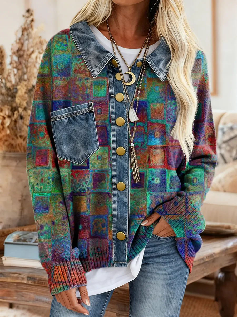 Ethnicity Geometry Colorful Patchwork Women's Art Print Comfortable Denim Patchwork Knit Sweater