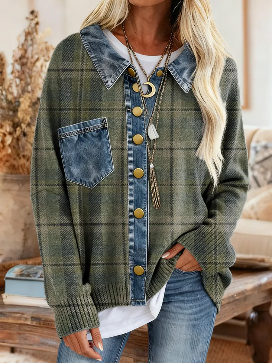 Ethnicity Green Checkered Pattern Women's Art Print Comfortable Denim Patchwork Knit Sweater