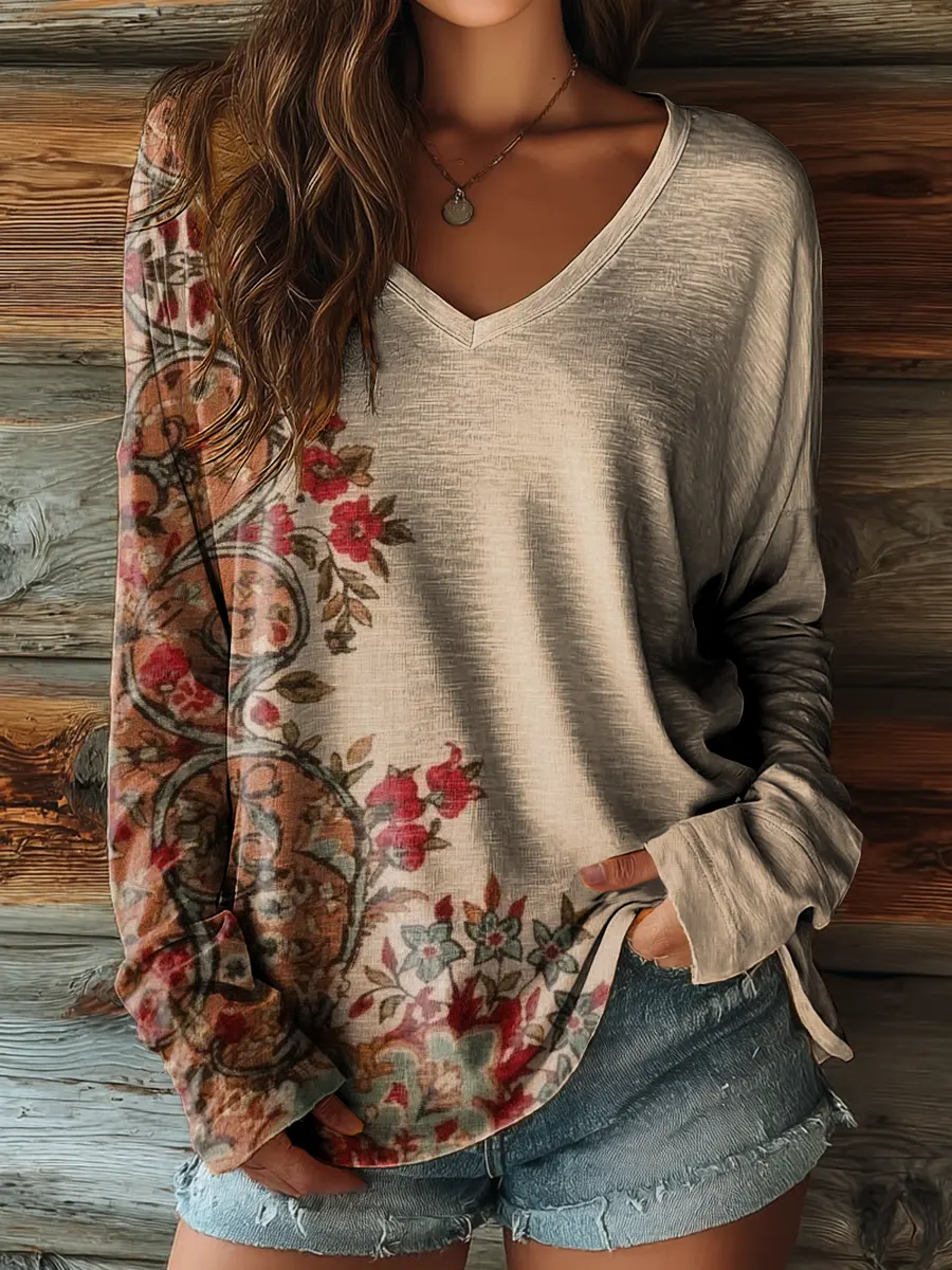 Women's Vintage Floral Pattern Art Print Casual V-neck Long-sleeve T-shirt