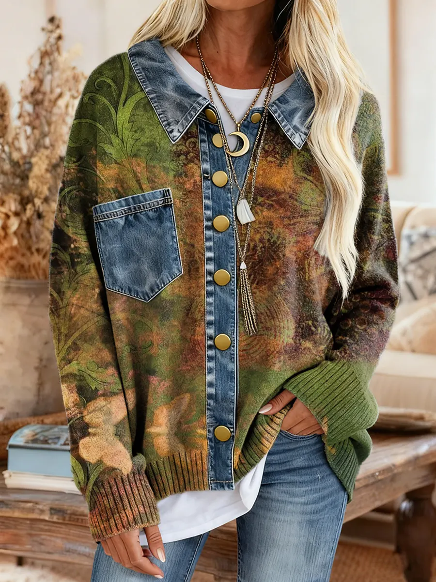 Ethnicity Colorful Tie Dye Women's Art Print Comfortable Denim Patchwork Knit Sweater