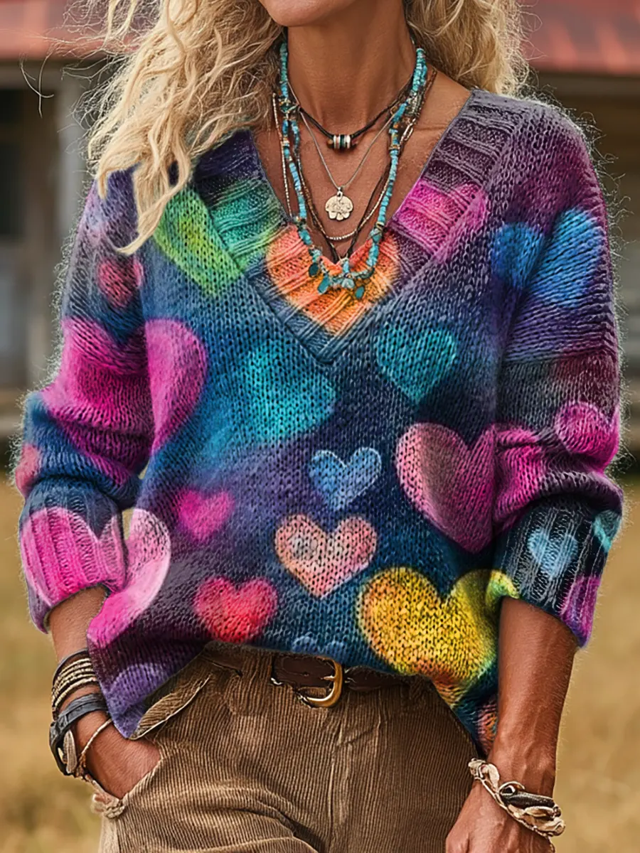 Colorful Gradation Love Women's Print V-neck Long Sleeve Sweater