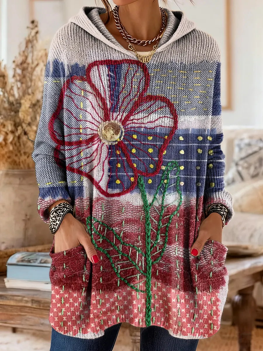 Ethnicity Flowers Texture Patchwork Women's Print Casual Long Sleeve Hooded Sweater