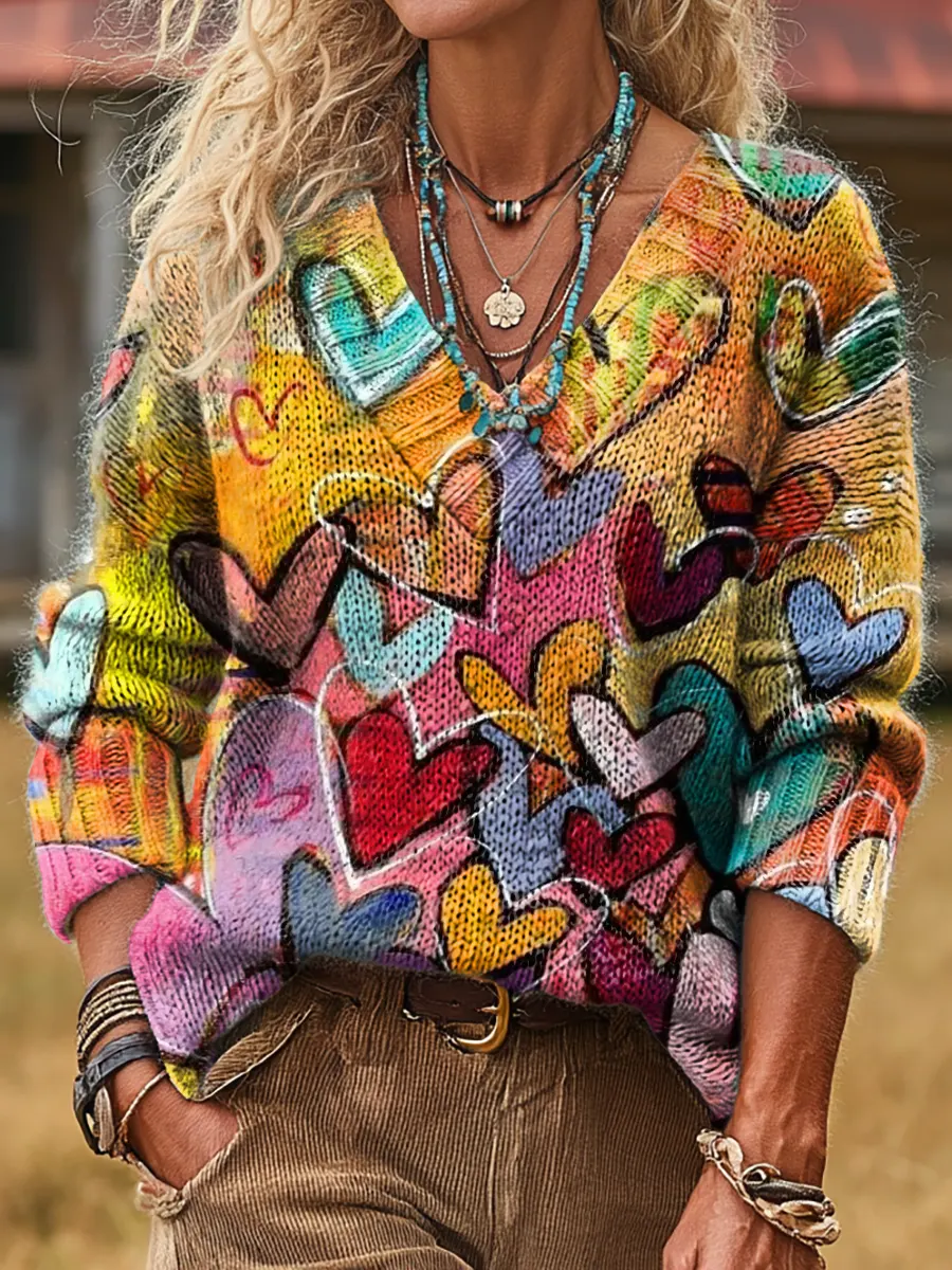 Ethnicity Colorful Love Patchwork Women's Print V-neck Long Sleeve Sweater