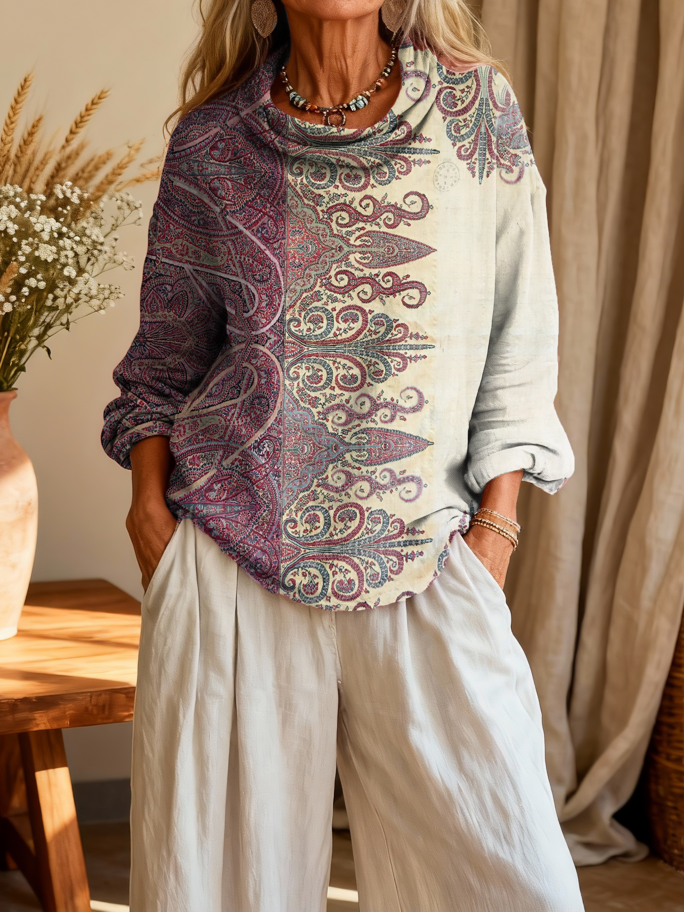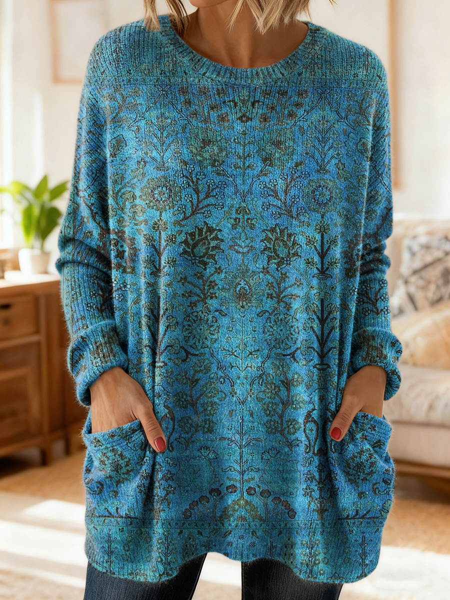 Women's Retro Ethnic Art Print Casual Long-Sleeved Round Neck Cotton Knit Sweater