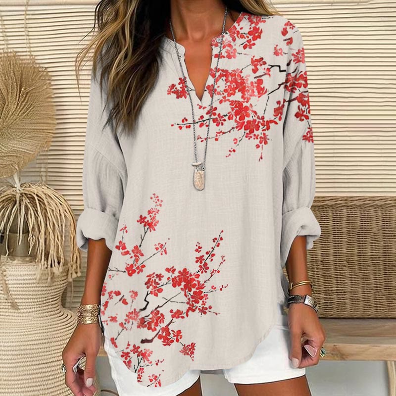 Dashingsoul Retro Japanese Art Plum Blossom Print V Neck Long Sleeve Blouse