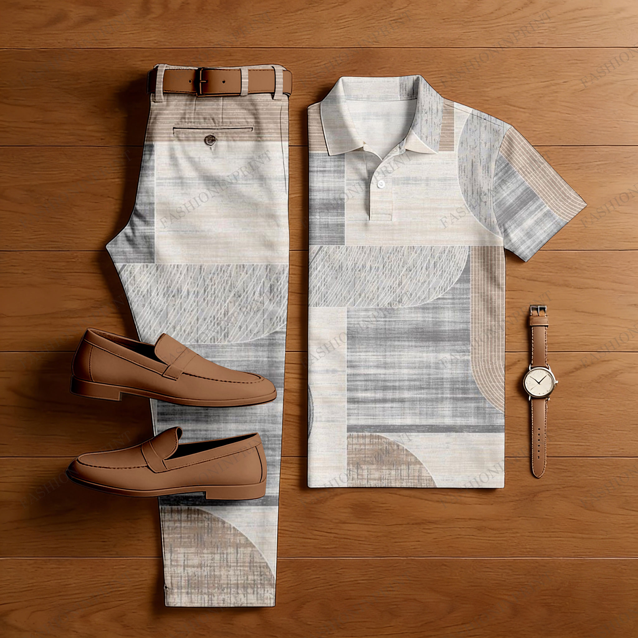 Men's Casual Multi Khaki Color Matching Geometric Printed Short Sleeved Polo Shirt & Trousers Two-Piece Set