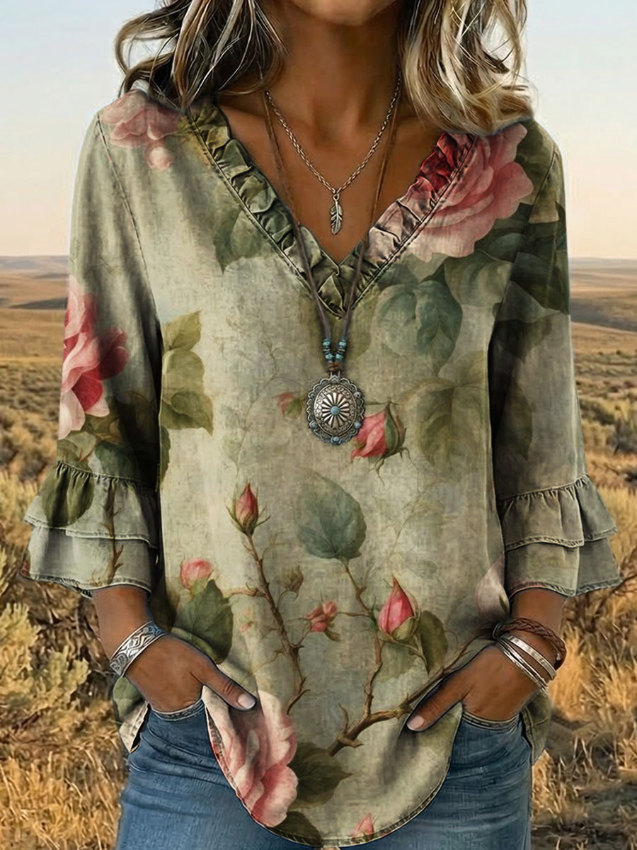 Women's Vintage Floral Print Casual V-Neck Ruffled Denim Shirt