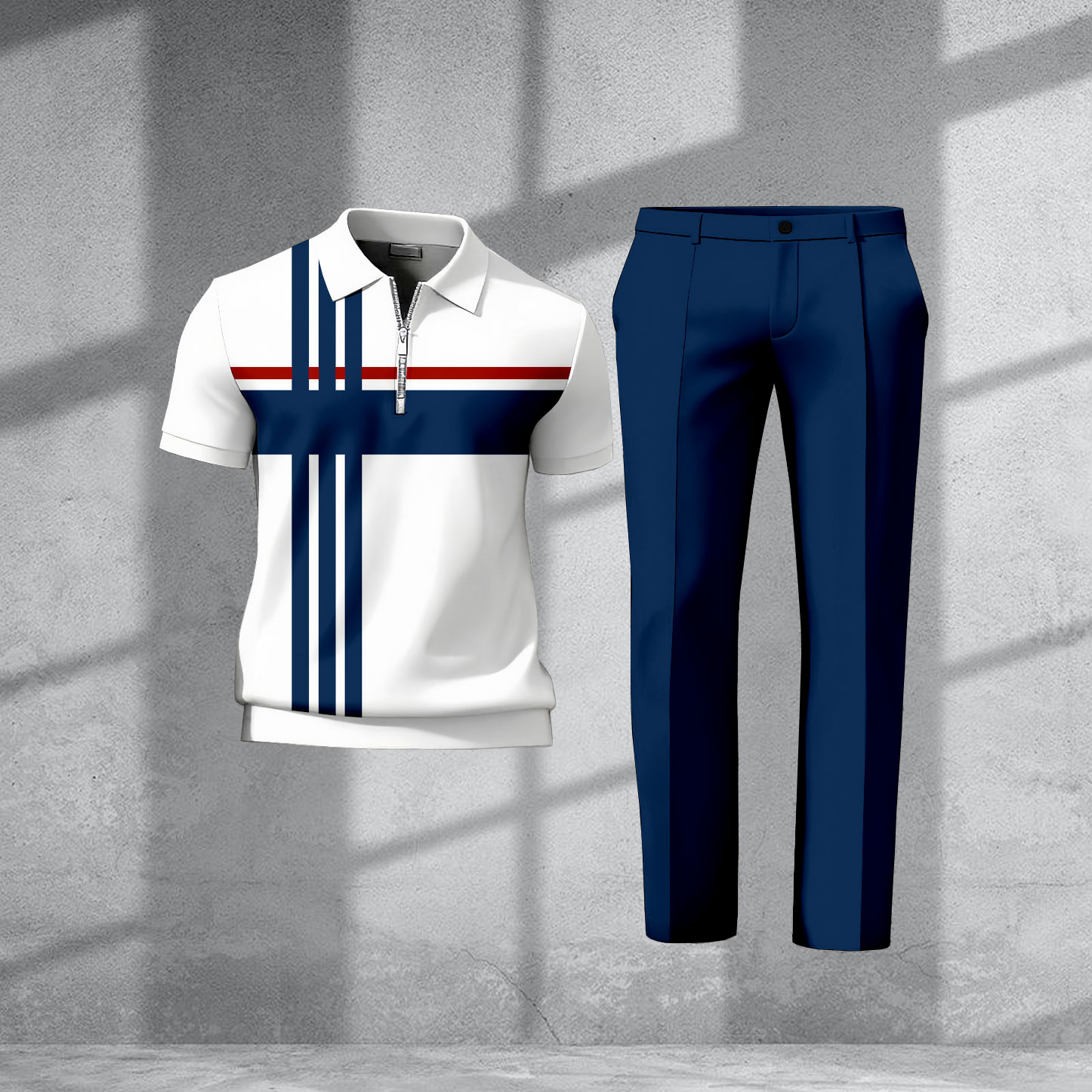 Men's Casual Two-Piece Set With Color Block Print Polo Collar Zipper Short-Sleeve T-Shirt And Pants