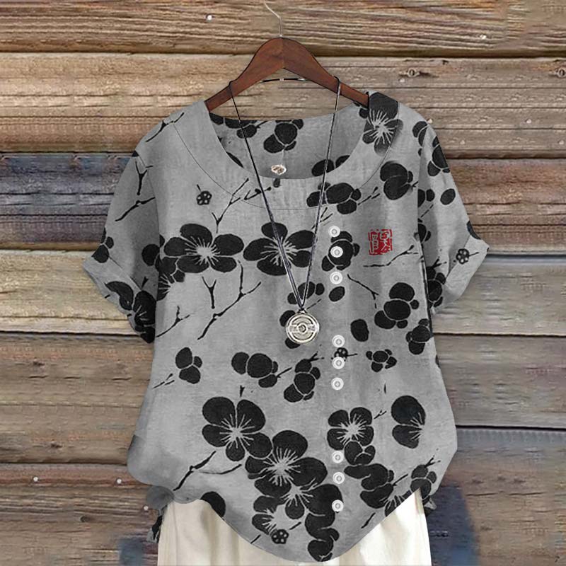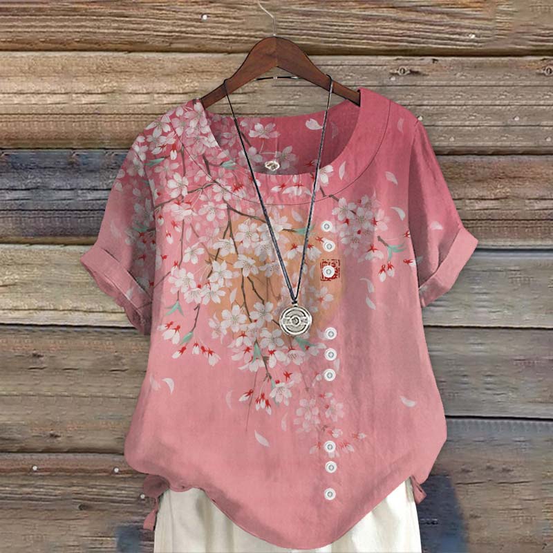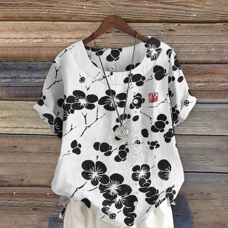 Dashingsoul Vintage Cherry Blossom Japanese Lino Art Print Short Sleeve Blouse