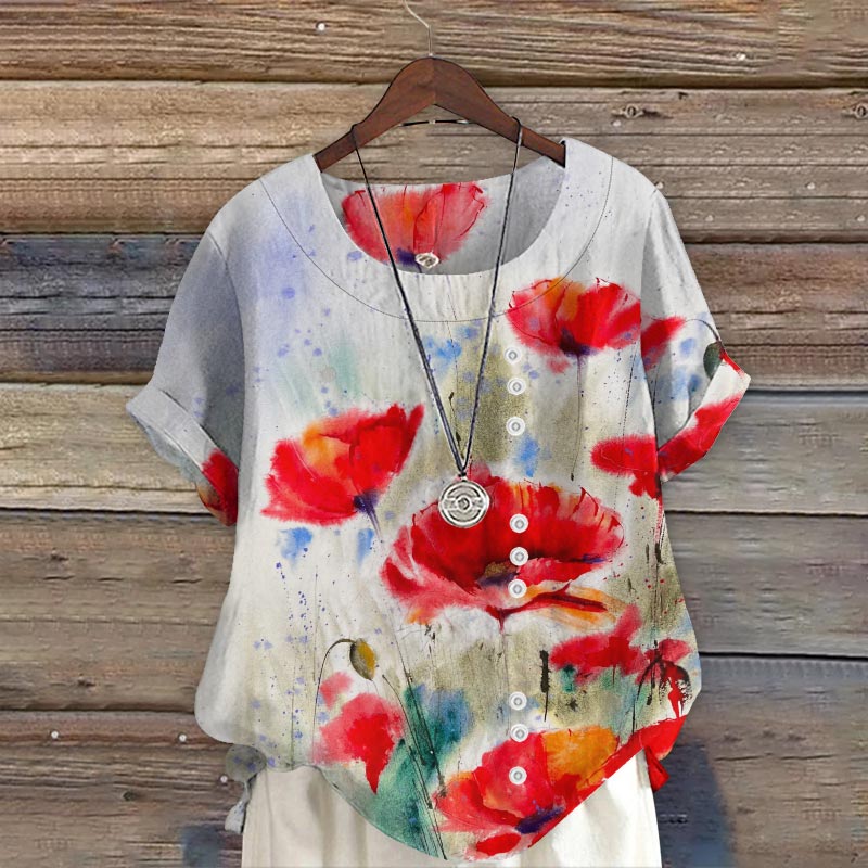 Dashingsoul Women's Artistic Watercolor Poppies Art Print Short Sleeve Blouse