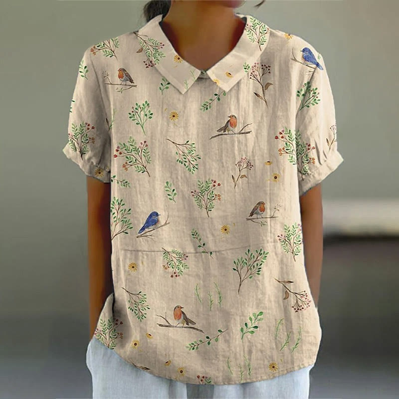 Dashingsoul Boughs And Robin Birds Pattern Printed Women's Casual Blouse