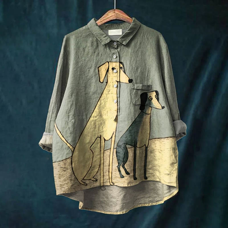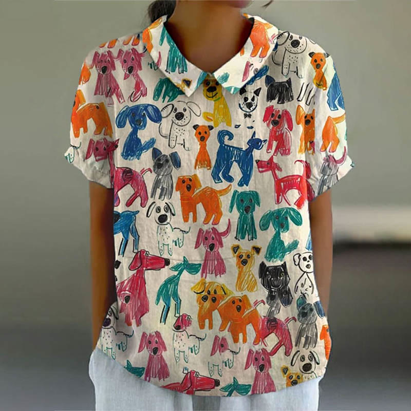 Dashingsoul Women's Watercolor Painting Dogs Graffiti Art Print Casual Lapel Loose Blouse