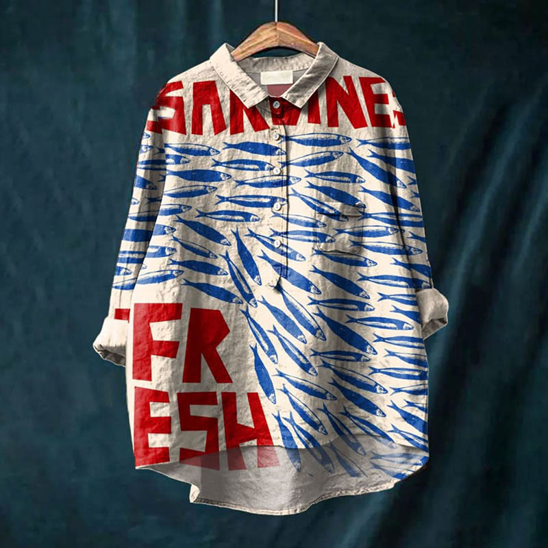Dashingsoul Women's Fashion Fresh Sardines Art Print Casual Lapel Blouse