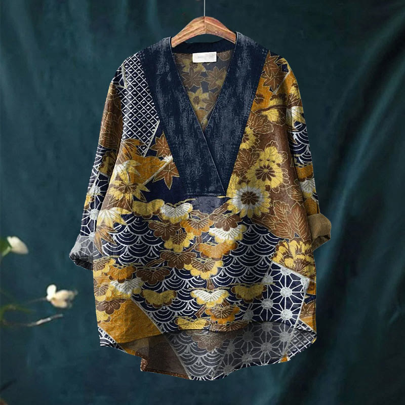 Women's Japanese Vintage Lotus Art Printed Casual V-neck Blouse