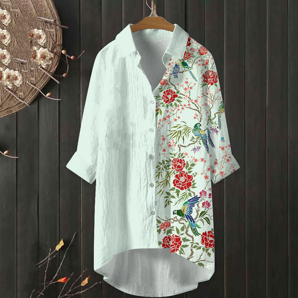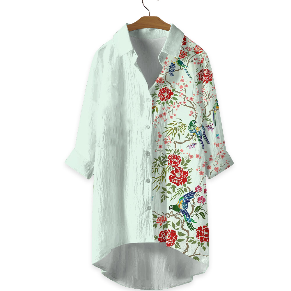 Dashingsoul Japanese Parrot Peony Flower Print Casual Shirt