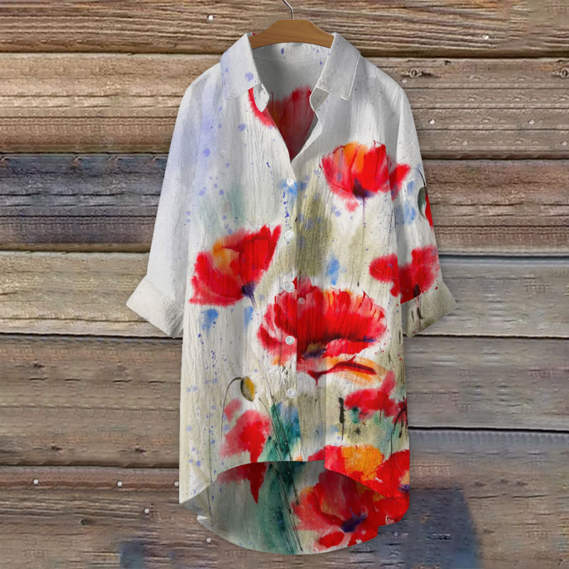 Dashingsoul Women's Artistic Watercolor Poppies Art Print Casual Shirt