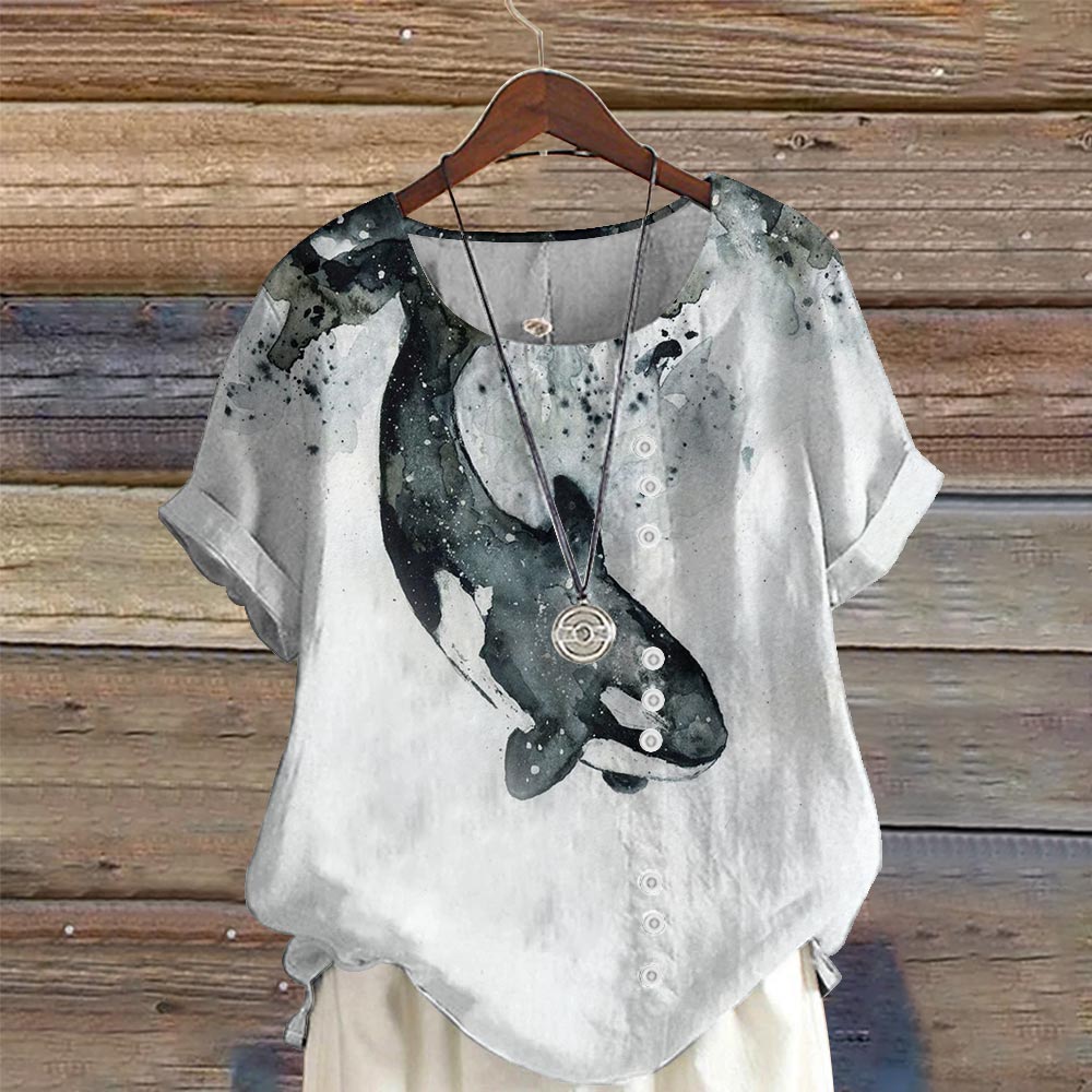 Dashingsoul Watercolor Killer Whale Print Casual Short Sleeve Blouse