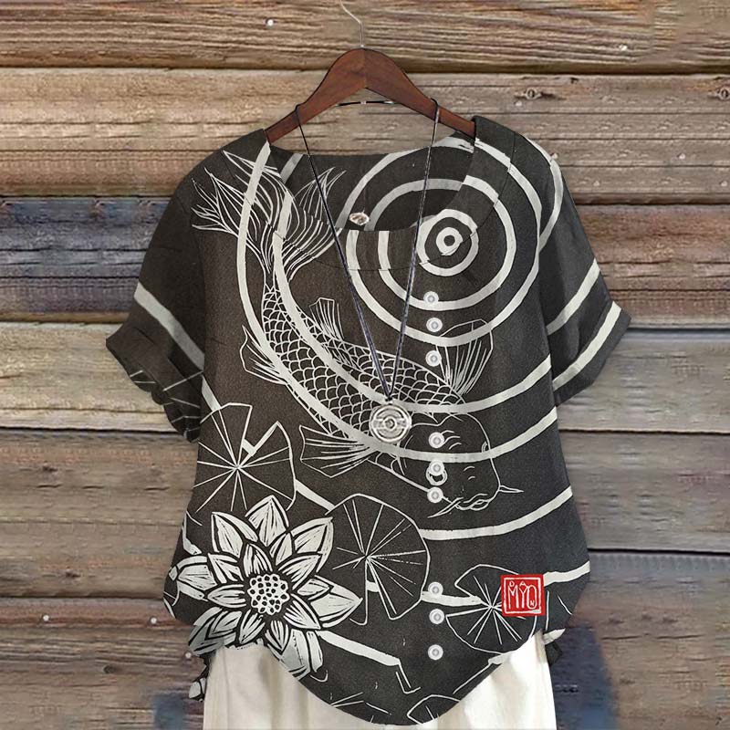 Dashingsoul Vintage Japanese Koi Fish Simple Line Art Print Short Sleeve Blouse