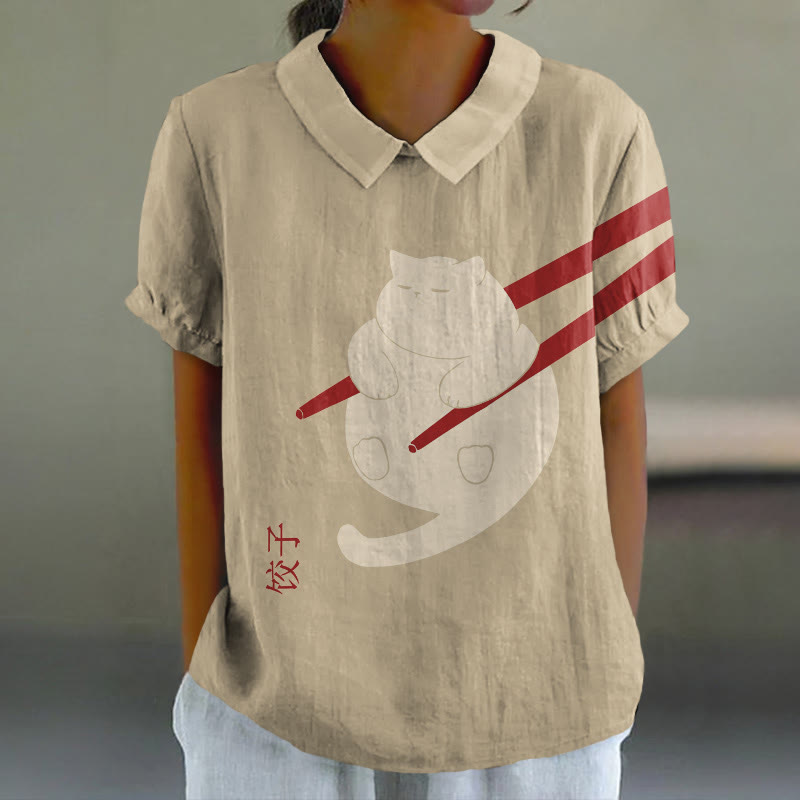 Dashingsoul Cat Dumpling Art Print Casual Lapel Loose Blouse