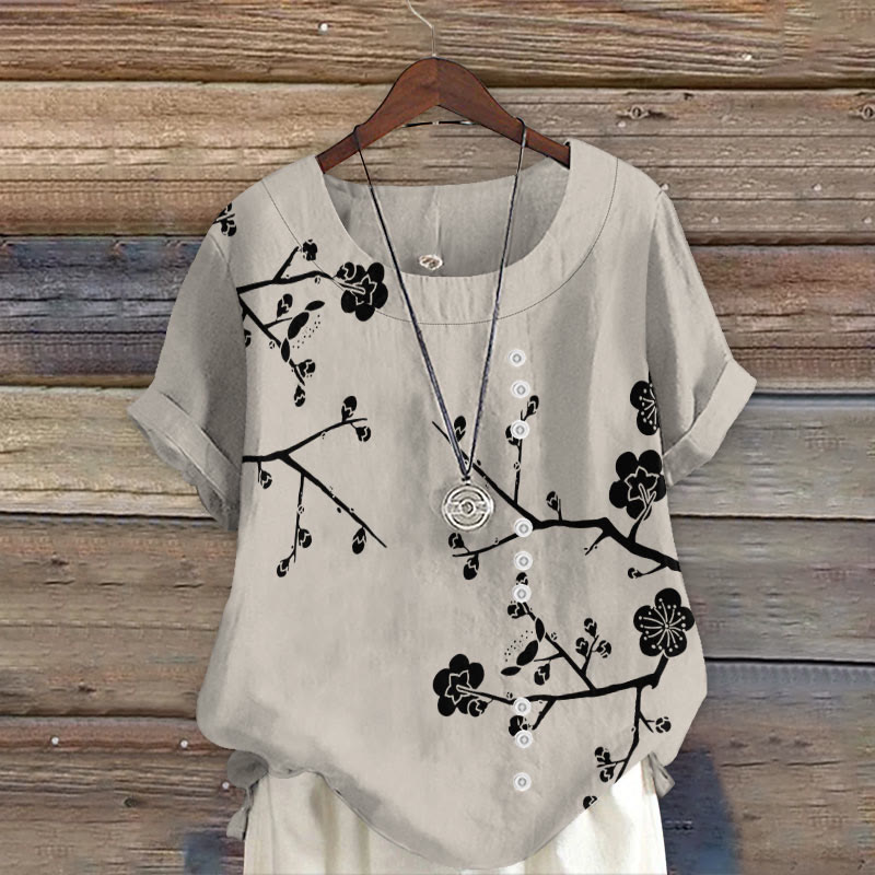 Vintage Plum Blossom Art Print V Neck Half Sleeve Blouse