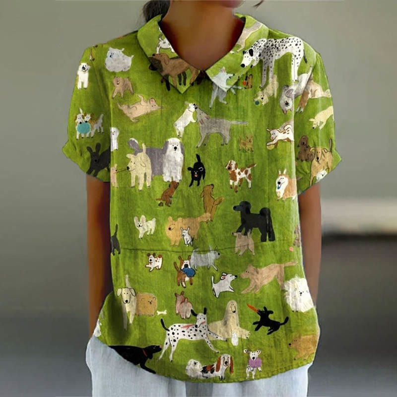 Dashingsoul Women's Oil Painting Lovely Pet Dogs Art Print Casual Lapel Loose Blouse