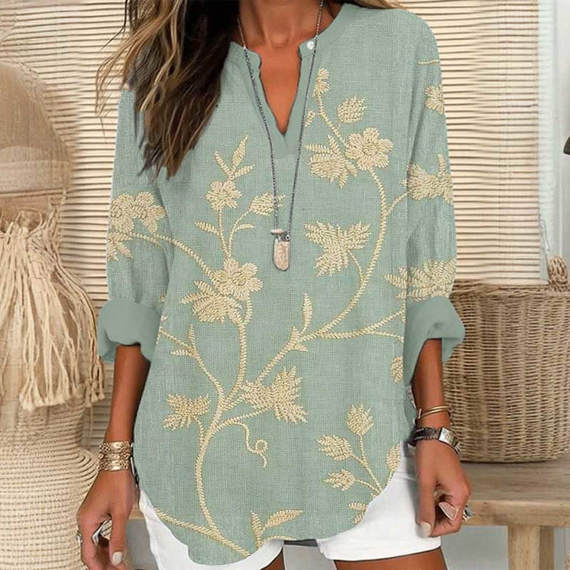 Dashingsoul Women's Unique Printed Green Print V Neck Long Sleeve Blouse