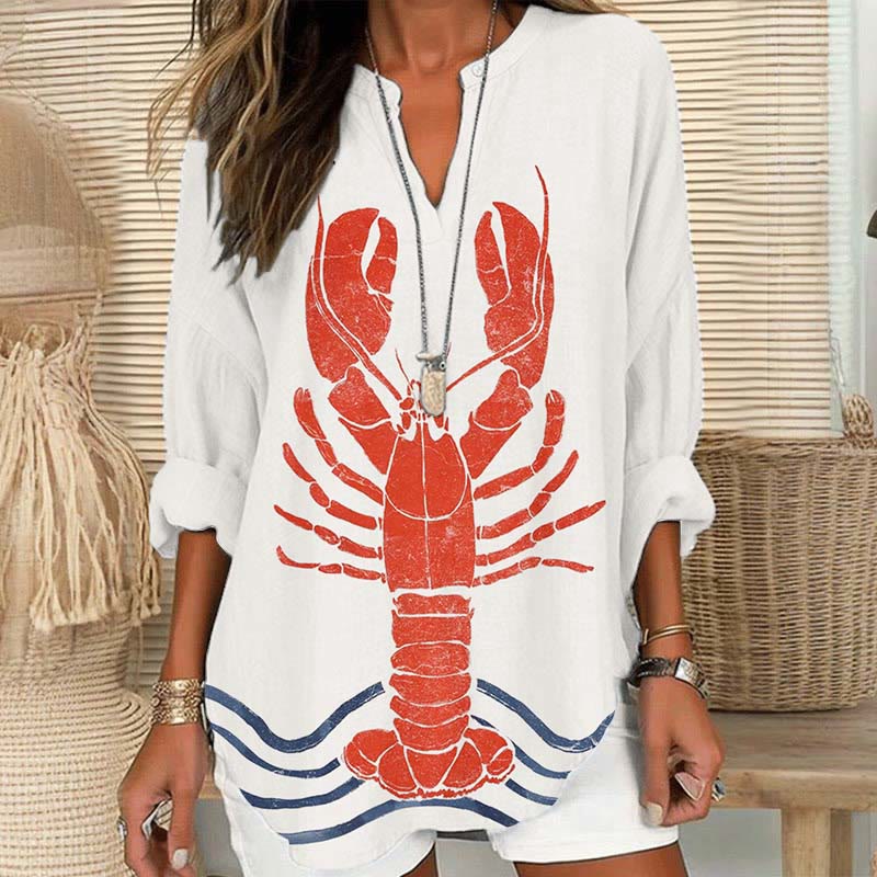 Dashingsoul Women's Vintage Lobster Art Print V Neck Long Sleeve Blouse
