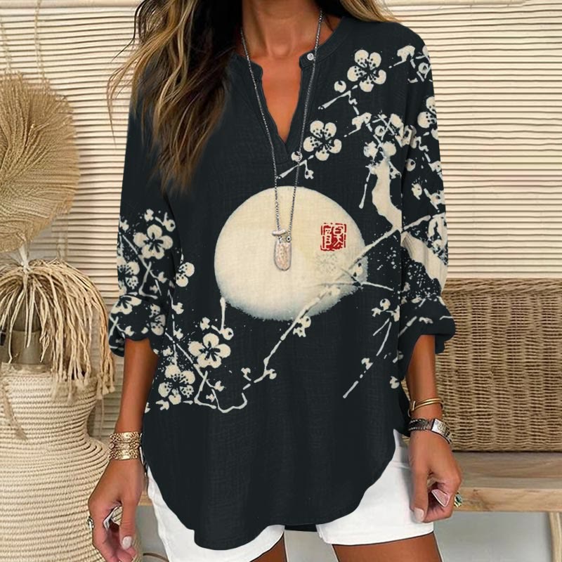 Dashingsoul Plum Blossom & Moon Japanese Art Print V Neck Long Sleeve Blouse