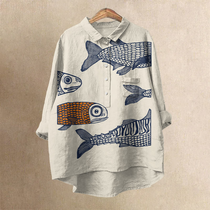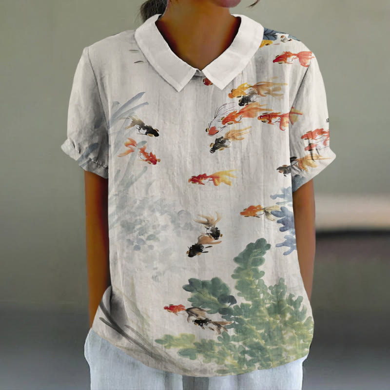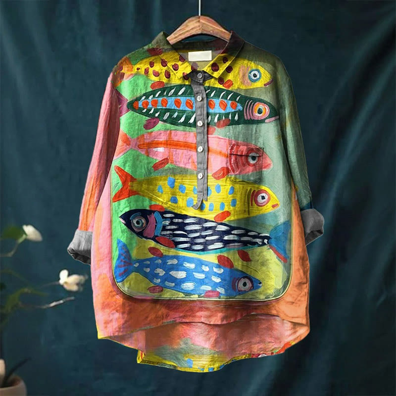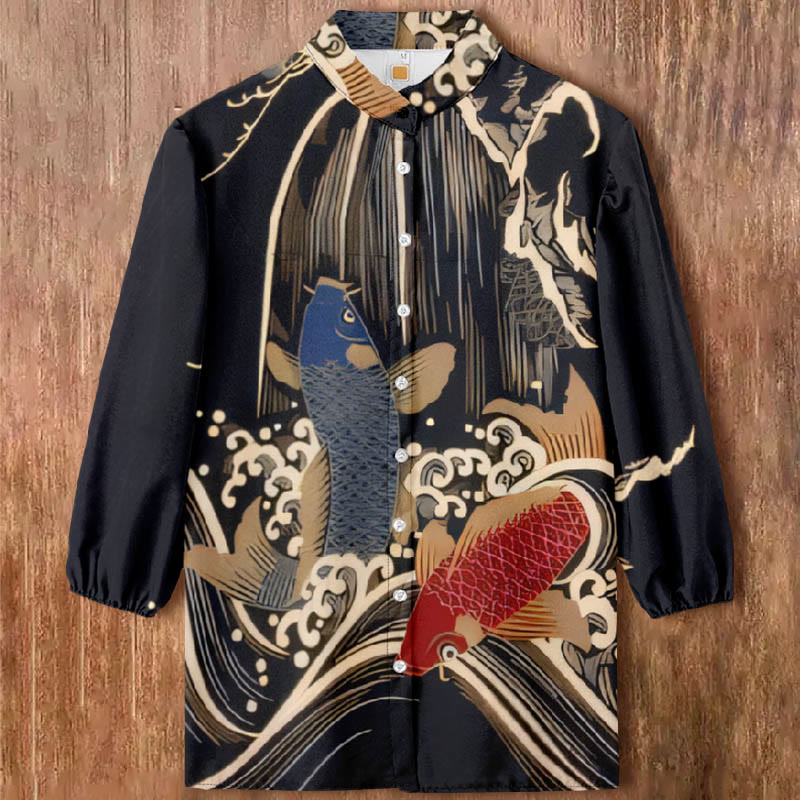 Dashingsoul Women's Watercolor Goldfish Art Print Casual Lapel Loose Blouse