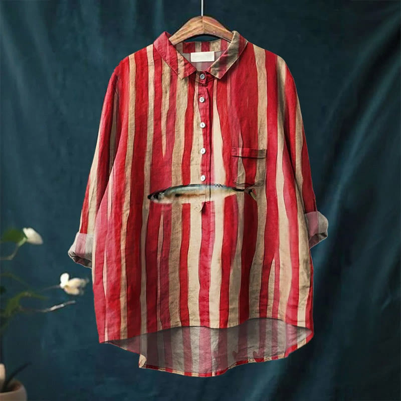 Dashingsoul Women's Red Striped Sardines Print Casual Lapel Blouse