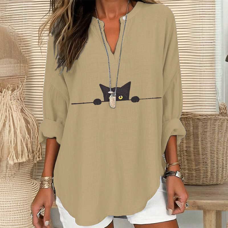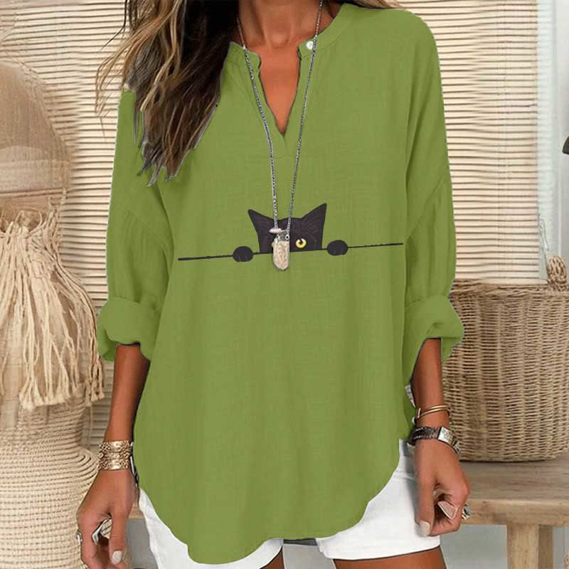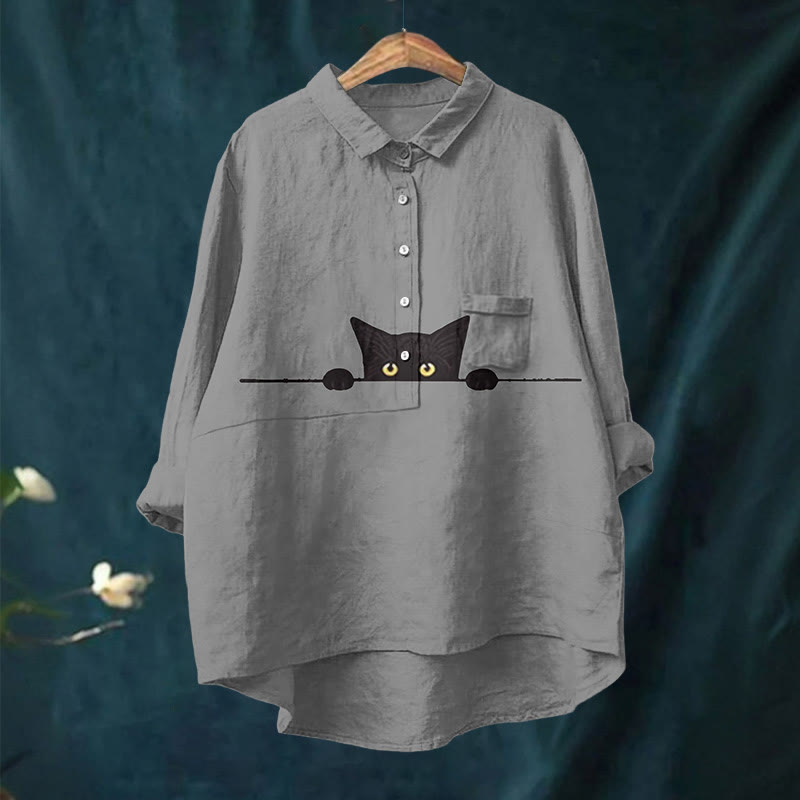 Dashingsoul Women's Funny Peeping Little Cat Art Print Casual Lapel Blouse