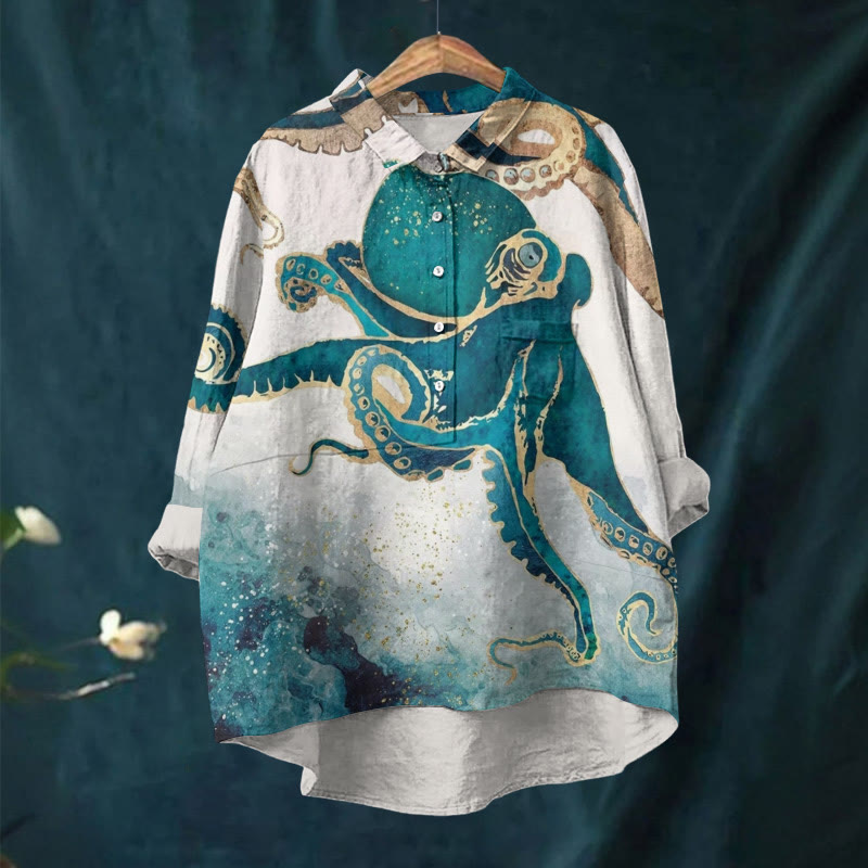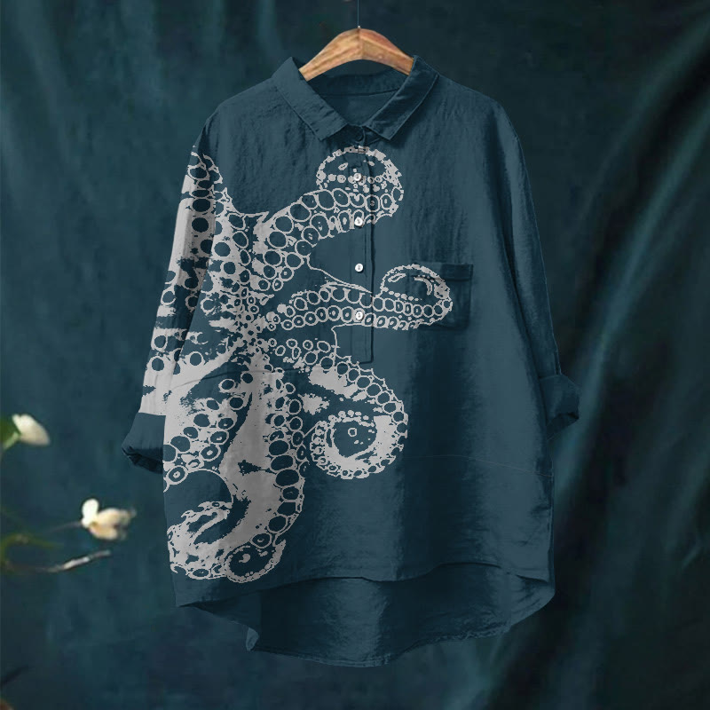 Dashingsoul Psychedelic Seascape Octopus Art Print Casual Lapel Blouse