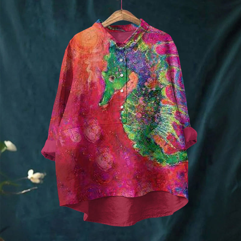 Dashingsoul Contrast Color Seahorse Oil Painting Print Casual Lapel Blouse