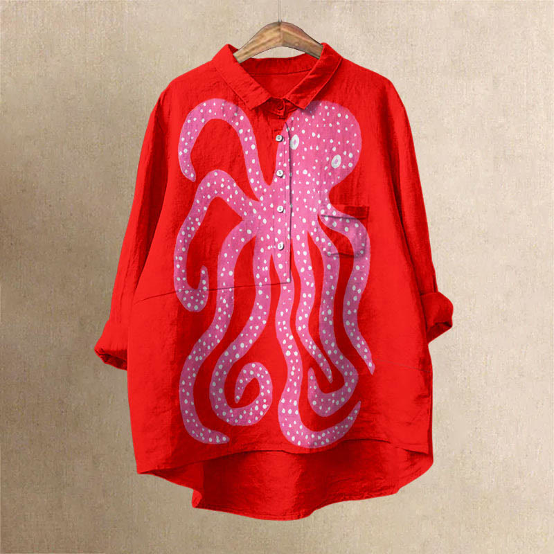 Dashingsoul Women's Oil Painting Pink Octopus Art Print Casual Lapel Blouse